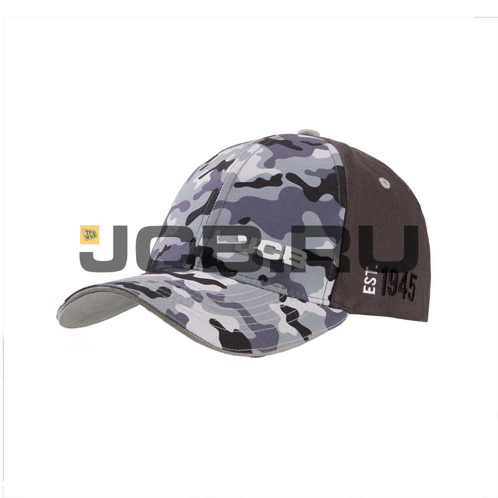Камуфляжная бейсболка из шести панелей с логотипом JCB на передней части.